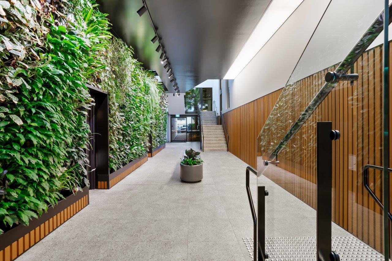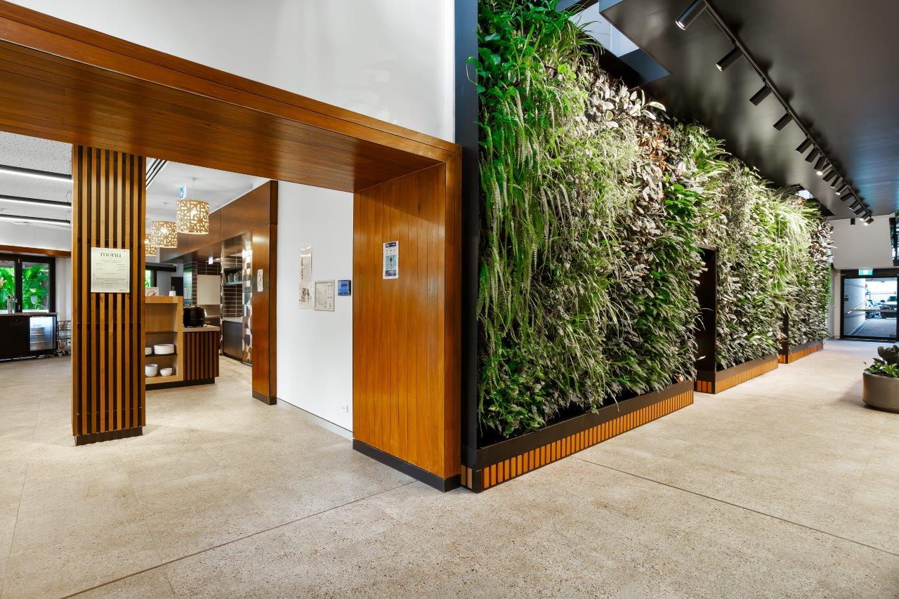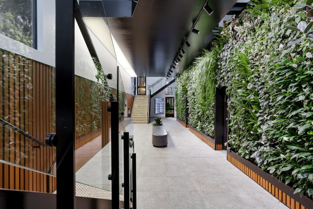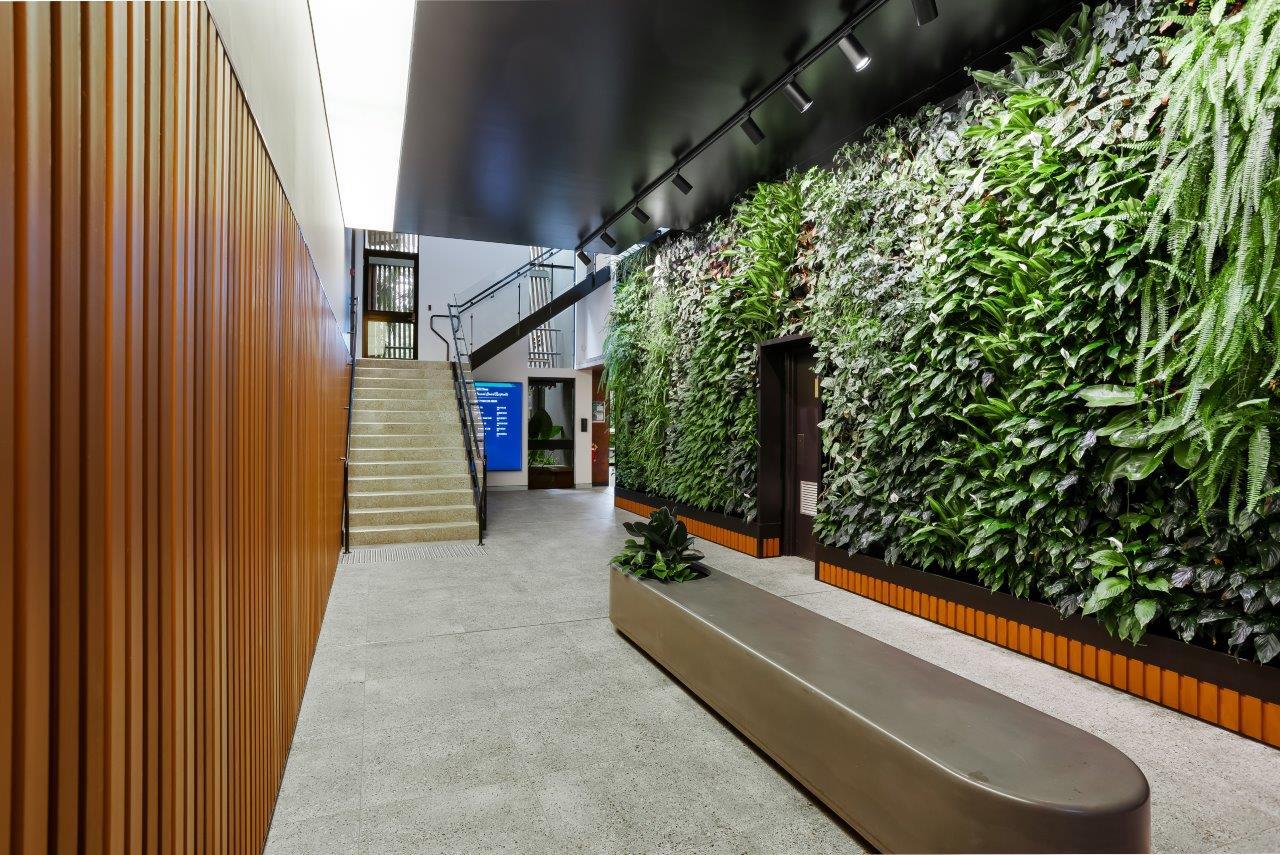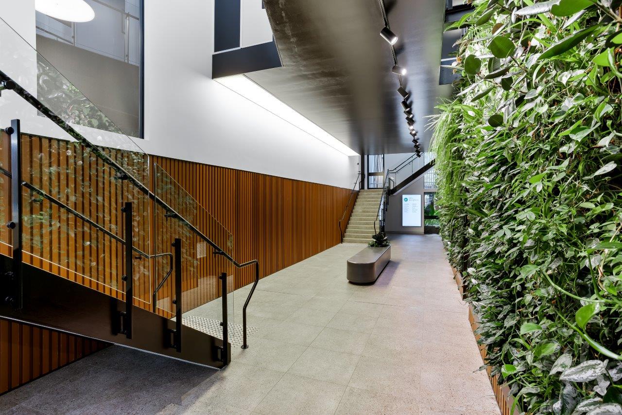 The first stage of the refurbishment involved significant upgrades to the building’s central atrium and lower-ground amenities. One of the standout features was the installation of a striking four-metre-high living green wall, designed to bring natural vibrancy into the space. A key element of this stage was the creation of a unique ‘floating’ room pod, engineered using structural steel that not only acted as the floor of the pod but also supported the integrity of the existing building. To enhance the overall aesthetic, the pod was finished with premium materials, including Danpal wall linings, which created a distinctive lightbox effect.